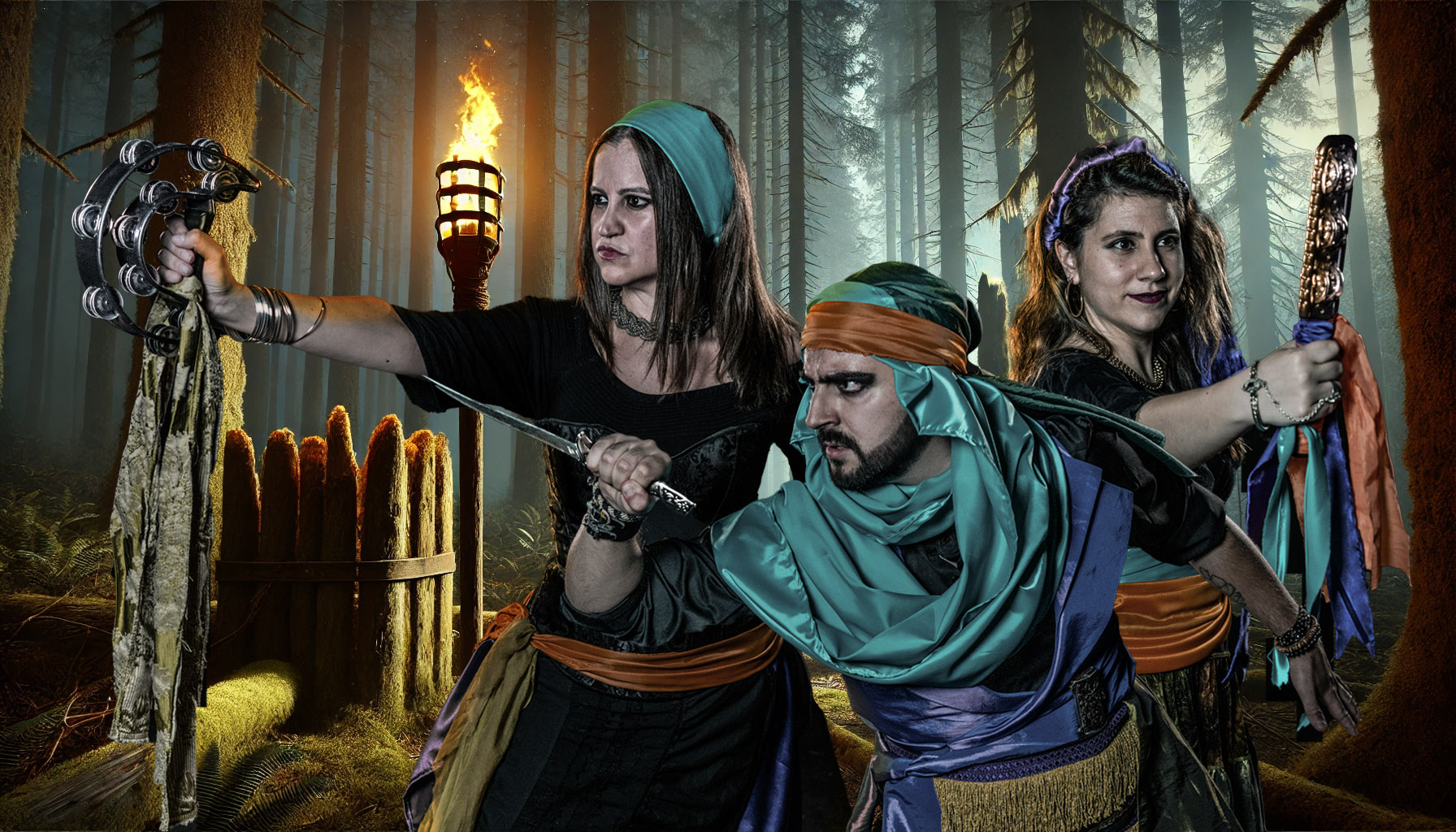 Con un movimiento fluido, se irguió sobre él, oscilando levemente su cuerpo en un vaivén hipnótico. Alzó la pandereta-vara y la hizo girar en el aire. Las hojas secas que alfombraban el suelo se elevaron, girando a su alrededor como una danza encantada. Su voz, apenas un susurro, se filtró entre los árboles.